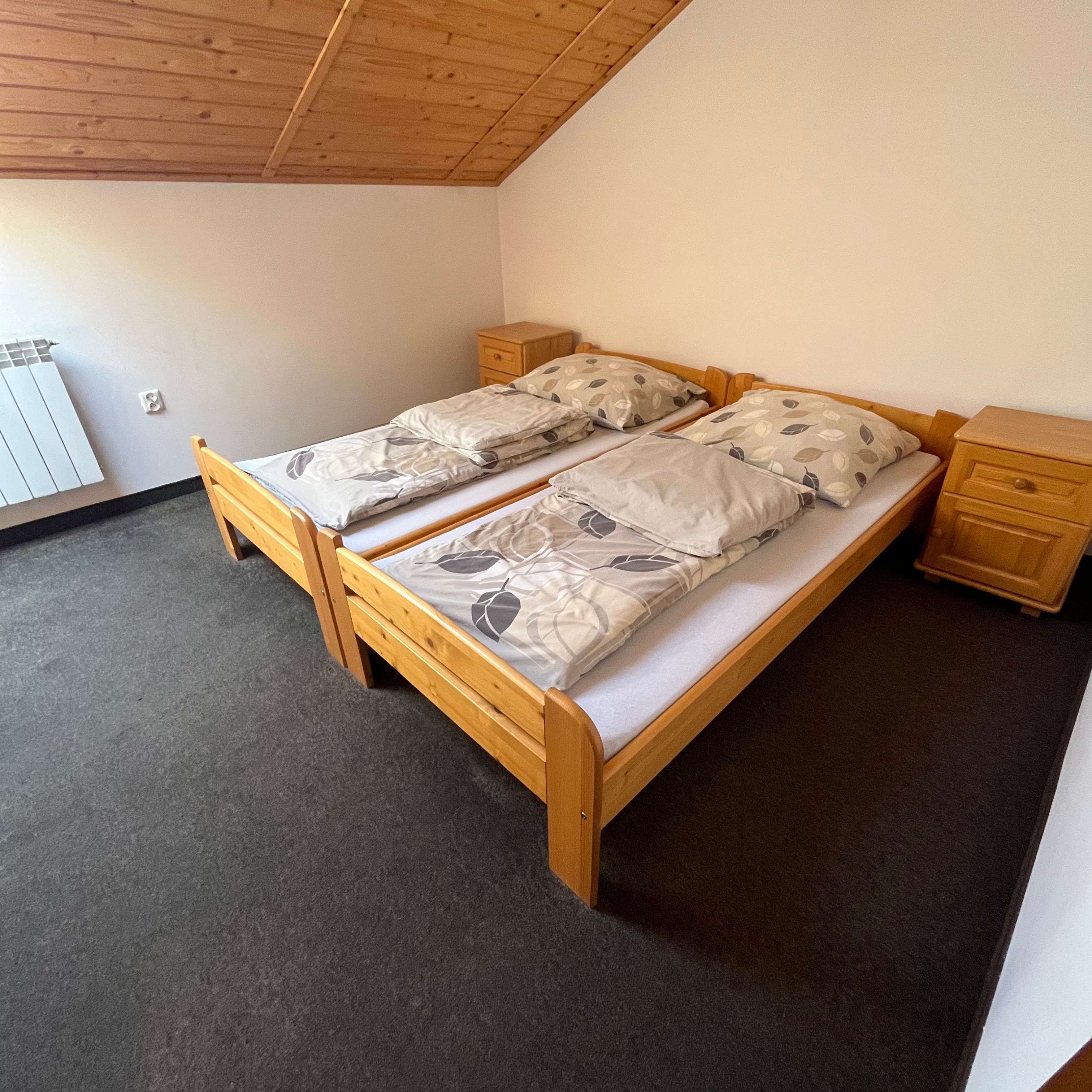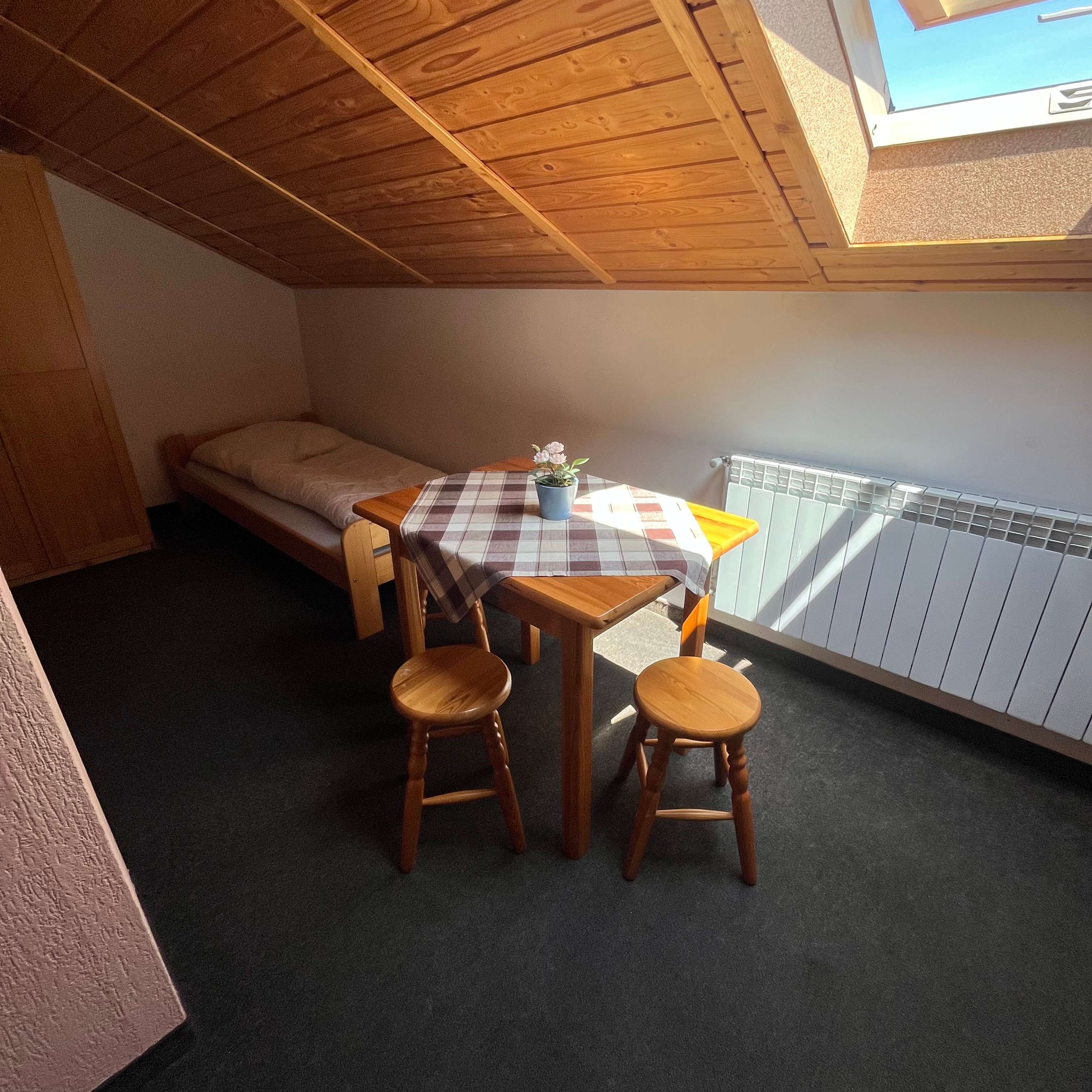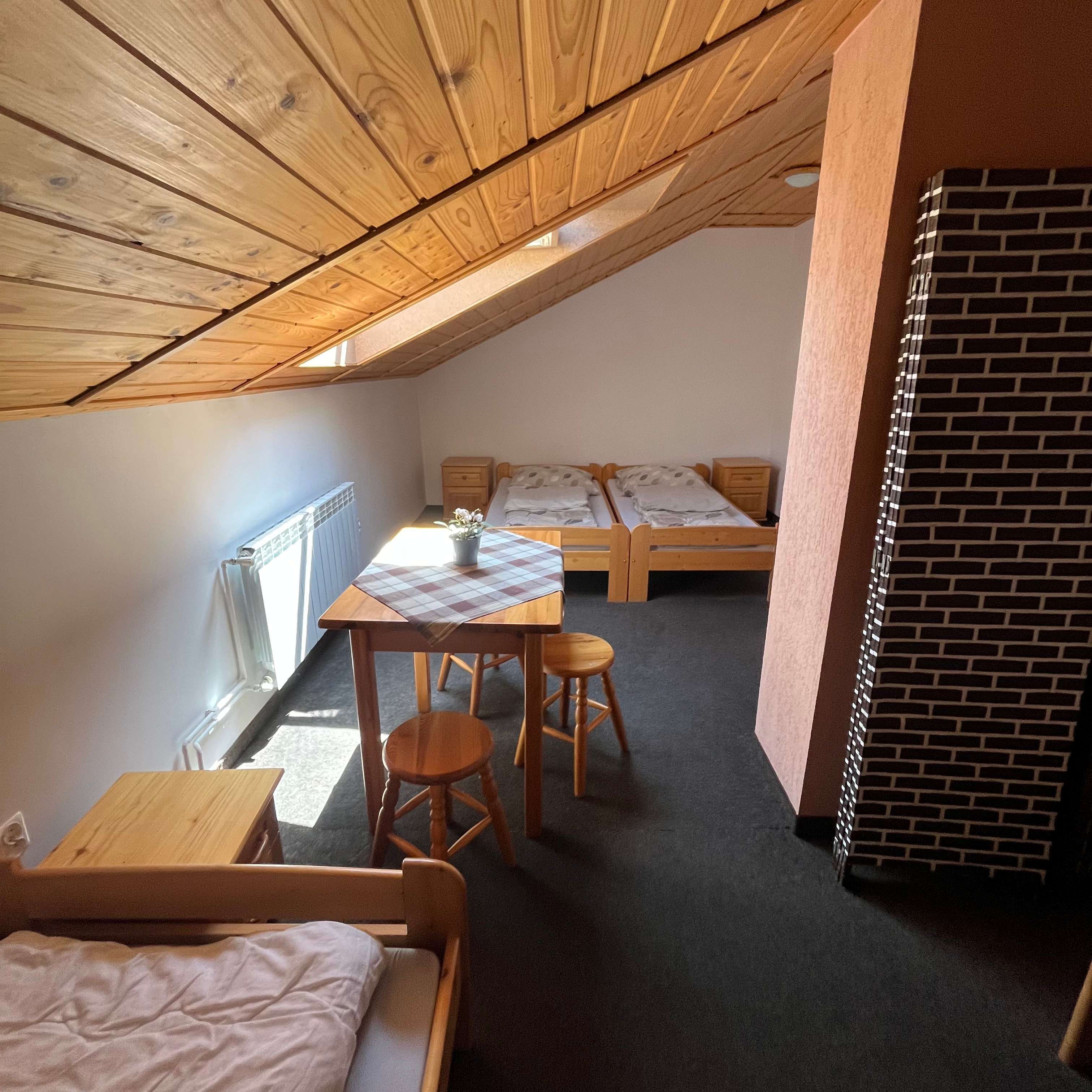 Ten przestronny pokój, usytuowany na piętrze, to idealne miejsce dla grupy przyjaciół, którzy chcą wspólnie odpocząć w górskim klimacie i złapać oddech od codzienności. Jasne wnętrze, drewniane akcenty i widok z okna na beskidzkie wzgórza tworzą atmosferę sprzyjającą relaksowi i rozmowom do późnej nocy.